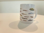 2024年に確認されている大阪府八尾市の在来魚類全種があしらわれたマグカップです。